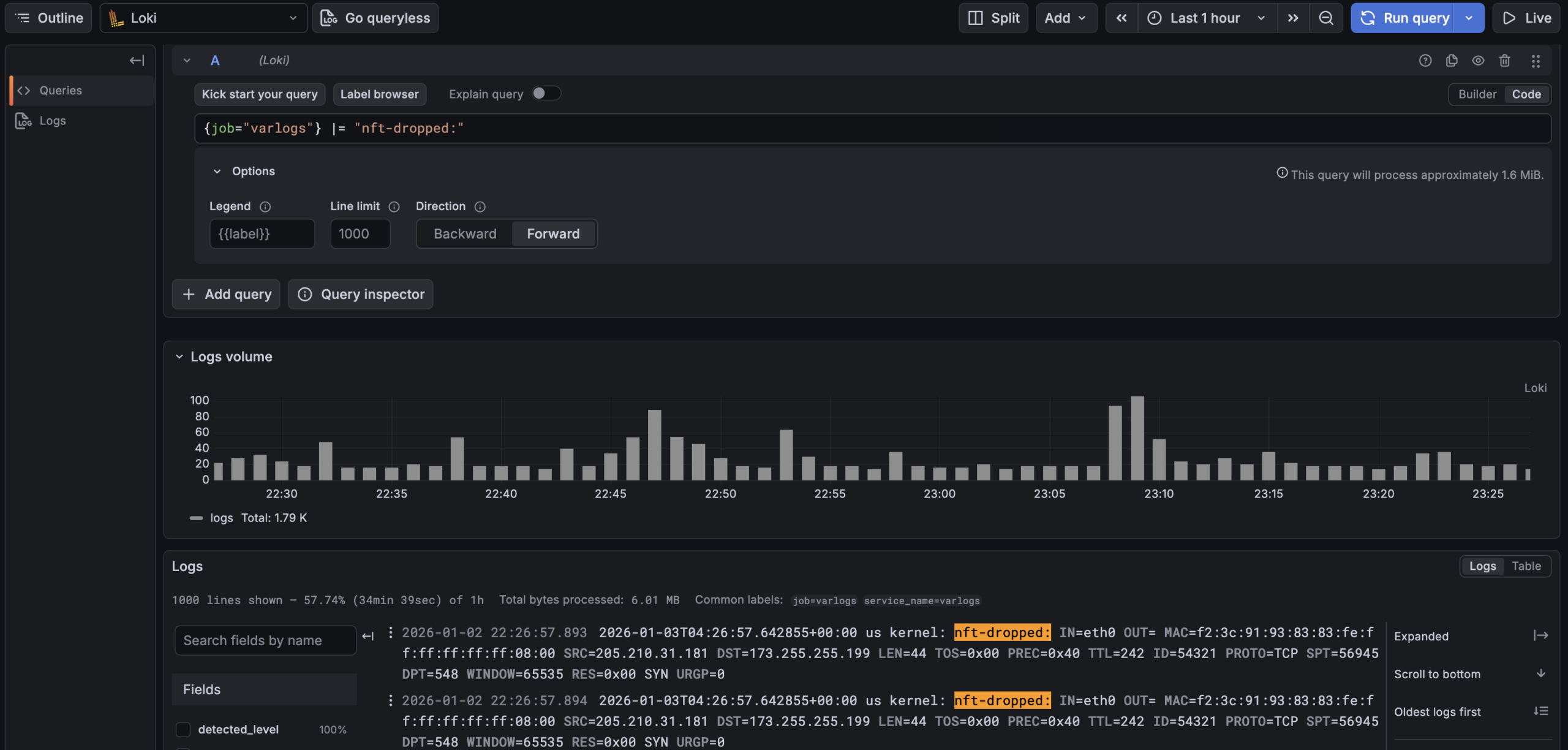 by promtail into Grafana Loki. So I can use logql to query all my dropped traffic. Due to the nftables log lines being key value pairs the built in "logfmt" parser can make many parts of the log line to be "lables" to filter with.