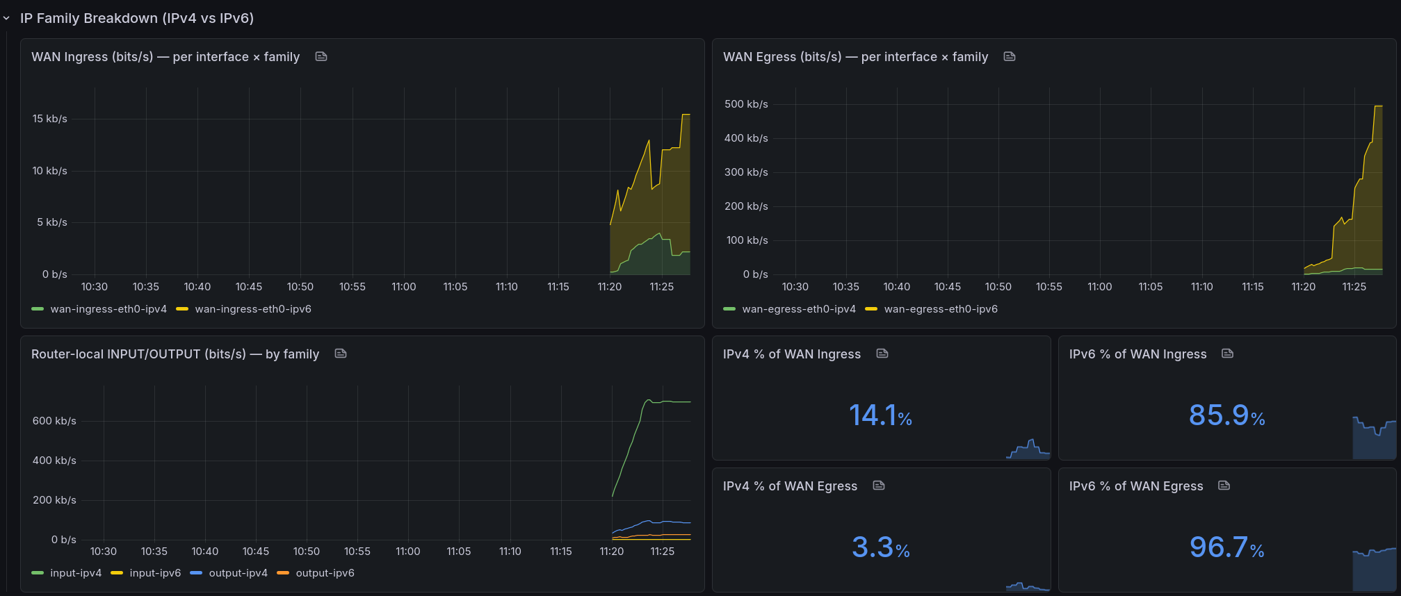 - IP Family Breakdown — the new kids. Stacked WAN ingress bps, stacked WAN egress bps, a per-family router-local panel, and a 2×2 grid of stat panels for IPv4 % / IPv6 % on each direction.